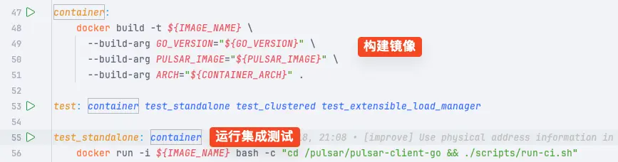 還是以我熟悉的 Pulsar 的 go-client 為例,它在 GitHub 的集成測試是通過 GitHub action 觸發的,定義如下: