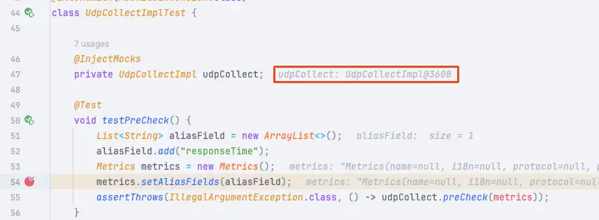 當我們 debug 運行時會發現 udpCollect 對象是有值的,而如果我們去掉這個註解 @InjectMocks 再運行就會拋空指針異常。