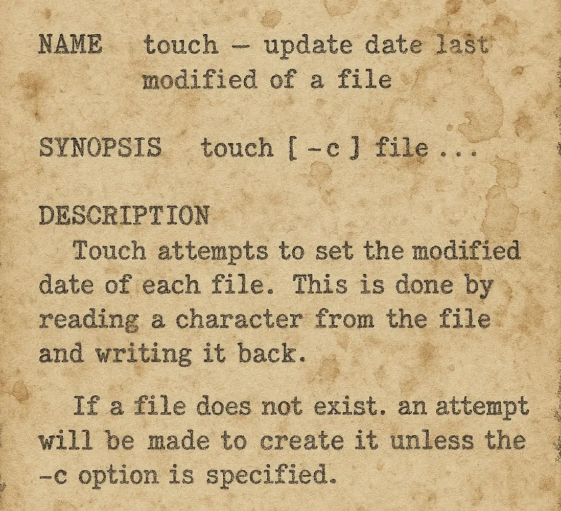 touch命令的最初版本可以追溯到1979年發佈的Unix第7版。那時,它還只是一個不到100行的小程序。在當年的手冊頁裏,touch命令被簡潔地描述為:“update date last modified of a file”——即修改文件的最後變更時間