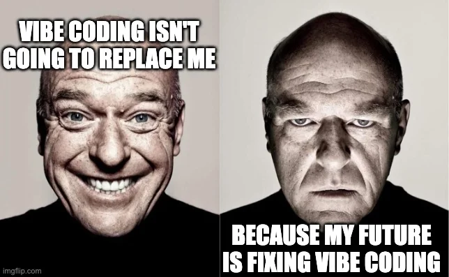 所以好消息是,未來幾年我不會被 AI 取代,但壞消息是,我還能保住程序員的飯碗,僅僅因為需要有人負責收拾 Vibe Coding 留下的爛攤子!