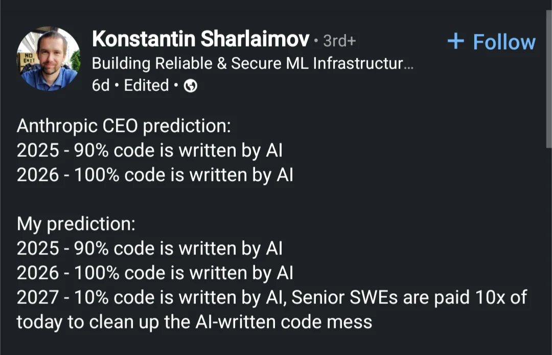 可不是麼,今年 90% 的代碼都將是 AI 生成的了,到了明年 2026 年,估計代碼就能 100% 交給 AI 來寫了。步入 2027 年,資深工程師們終於可以大展身手了——花十倍的力氣,專心清理 AI 生成的‘垃圾代碼’!