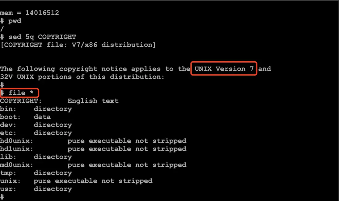 運行在 Unix V7 模擬器上的file命令。這裏輸出了根目錄下所有文件的類型。可見,文件“COPYRIGHT”是一個英文文檔