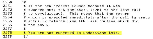 這行註釋常被用來“質疑”Unix 註釋的質量。看上去就像是貝爾實驗室的大佬們寫完代碼後,扔下一句“你們愛明白不明白,看不懂也正常”,就瀟灑離場了。久而久之,甚至有人把它當成一種“無禮的挑戰”。