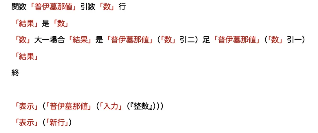 代碼中還有些漢字沒有括在「」之中,除了表示數字的零一二三四五六七八九,剩下的那些漢字相當於運算符和關鍵字。如 関數 相當於 Python 中的 def,表示開始定義函數。 是 相當於賦值的 =; 大 相當於比較運算符 >; 引 和 足 來自日語的引く和足す,分別表示減法和加法; 場合 一詞多出現在日語中表示”如果……就……“的句子中,正好對應 if 語句。