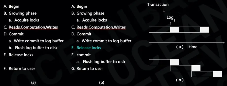 隨着在線交易、電商行業的發展,業務系統的熱點併發壓力逐漸成為一種挑戰。熱點賬户短時間內餘額大量更新,或者熱門商品在營銷活動中限時搶購,都是這種場景的直接體現。熱點更新的本質是短時間內對數據庫中的同一行數據的某些字段值進行高併發的修改(餘額,庫存等),這其中的瓶頸主要在於關係型數據庫為了保持事務一致性,對數據行的更新都需要經過 “加鎖->更新->寫日誌提交->釋放鎖” 的過程,而這個過程實質上是串行的。因此,提高熱點行更新能力的關鍵在於如何儘可能縮短持有鎖的時間。為了緩解熱點行更新的問題,OceanBase提出了提前解行鎖(Early Lock Release)的優化方案,其原理見圖6。