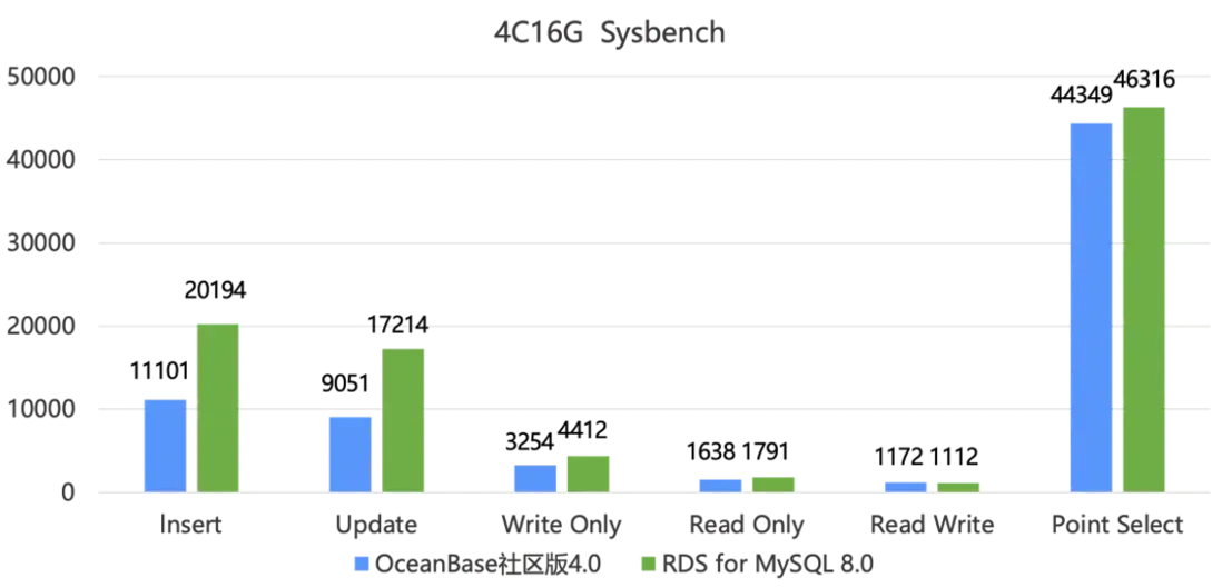 圖 4: 4C16G 規格 Sysbench 性能測試對比 OceanBase 社區版 4.0 v.s RDS for MySQL 8.0