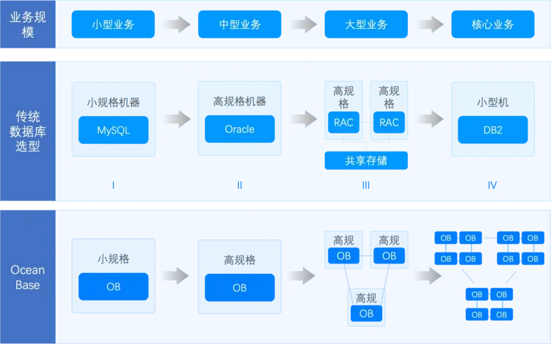 OceanBase“單機分佈式一體化”概念的提出,旨在探索用一套解決方案,應對企業在不同發展階段、不同業務體量帶來的不同挑戰,讓數據庫伴隨業務成長,滿足企業“一次選擇支撐全生命週期業務發展”的需求。