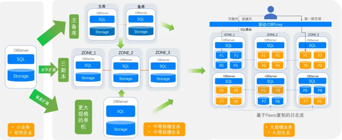 在初始階段,企業可以使用小規格機器部署單機 OceanBase。隨着數據規模的增長,可以選擇替換更大規格的單機進行垂直擴展,同時主備庫、三副本等部署模式支持企業的容災和高可用需求。當數據規模進一步擴展時,企業可以選擇水平擴展,擴大集羣規模,支撐大型業務。
