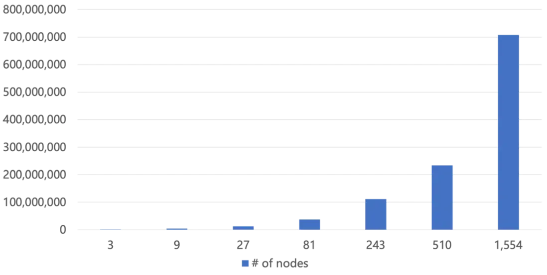 圖5展示了 TPC-C 測試 OceanBase 集羣節點數從 3 台機器擴展到 1500 台機器的過程中,tpmC 的數值變化。測試結果表明,即使在包含 10%分佈式事務的情況下,OceanBase 集羣性能仍能隨集羣規模擴展實現線性提升。