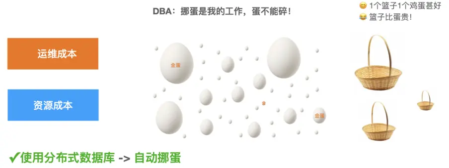 其次,從運維成本角度考慮,在保證系統穩定性的前提下,我們致力於降低運維複雜度。以 MySQL 為例,假設一個數據庫(database)是一個“蛋”,一個 MySQL 實例是一個“籃子”,那麼部署 1000 個數據庫時,應該如何合理分配到多個 MySQL 實例中?哪些數據庫應該放在同一個實例中?如果將兩個對資源要求都很高的重要數據庫放在同一個實例中,可能會導致資源搶佔。另外,如支付類數據庫,雖然數據量不大,但對業務要求極高,也不宜與其他數據庫放在同一個實例中。由於業務差異、優先級不同、數據增長速度各異以及 QPS(每秒查詢數) 要求不同,DBA 經常需要調整數據庫分佈。即便不考慮資源成本,僅運維挑戰就已相當大。我們期望分佈式數據庫能夠解決這一問題,幫助 DBA 自動調整數據庫分佈(見圖1)。