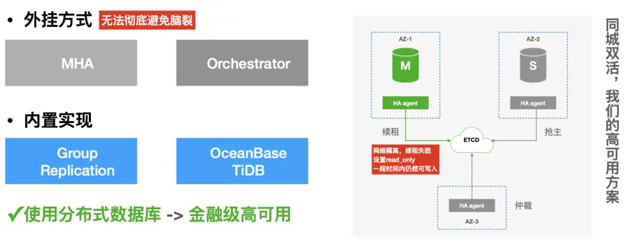 最後,從高可用角度考慮,我們期望保證集羣的高可用能力。在運維 MySQL 集羣時,我們通常採用 MHA、Orchestrator 等工具實現高可用,但它們都是“外掛”形式,本質上無法解決網絡分區導致的腦裂問題(見圖2)。因為數據庫和 MHA 組件是兩個獨立的軟件,不在同一個進程內,缺乏一致性協同控制。相比之下,MySQL 的 Group Replication 這類高可用架構更為可靠,它與 OceanBase 或 TiDB 等分佈式數據庫一樣,基於 Paxos 或 Raft 分佈式一致性協議,可以實現 RPO=0(數據丟失為零),RTO<30s(恢復時間目標小於30s)的高可用目標。
