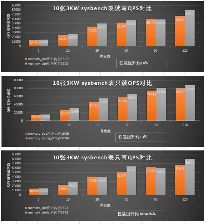 在不同租户內存配置下,性能也會有所不同。測試結果顯示,32GB租户內存相比16GB租户內存,性能提升約14%(見圖4)。