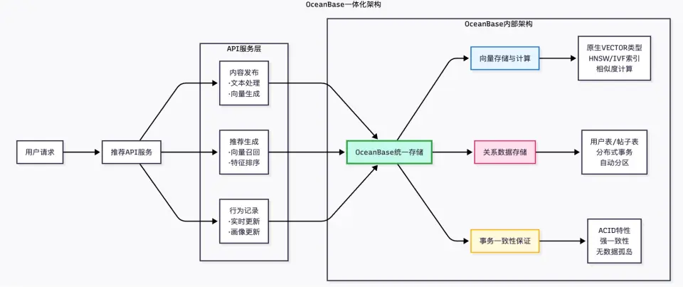 UGC 社區典型特點:內容量大、更新快、長尾重。推薦系統要同時兼顧“眼下的即時興趣”和“用户的穩定偏好”,並在一次請求內完成多路候選召回與融合,保證毫秒級延遲。 本文給出一套雙向量用户興趣 + 一次 SQL 多路召回的實踐方案,數據庫層使用 OceanBase 原生向量能力,結構化與向量同庫,避免“兩庫同步/一致性坑”。