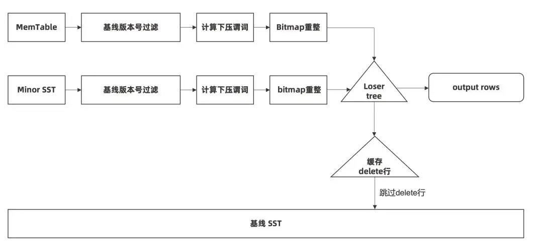 3. 原來增量數據和基線數據的查詢會用一棵敗者樹,當有主鍵交叉或者重疊時,弱化了基線數據的批處理能力。在查詢流程中將這兩部分拆開之後,基線數據的批處理只有在過濾之後仍有 delete 行的條件下,才會按批去做主鍵去重,基線的批處理能力得到了很大的增強。