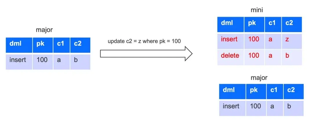 1. 寫入時會將 update 拆解為 delete + insert,insert 行會寫入所有列的最新值。