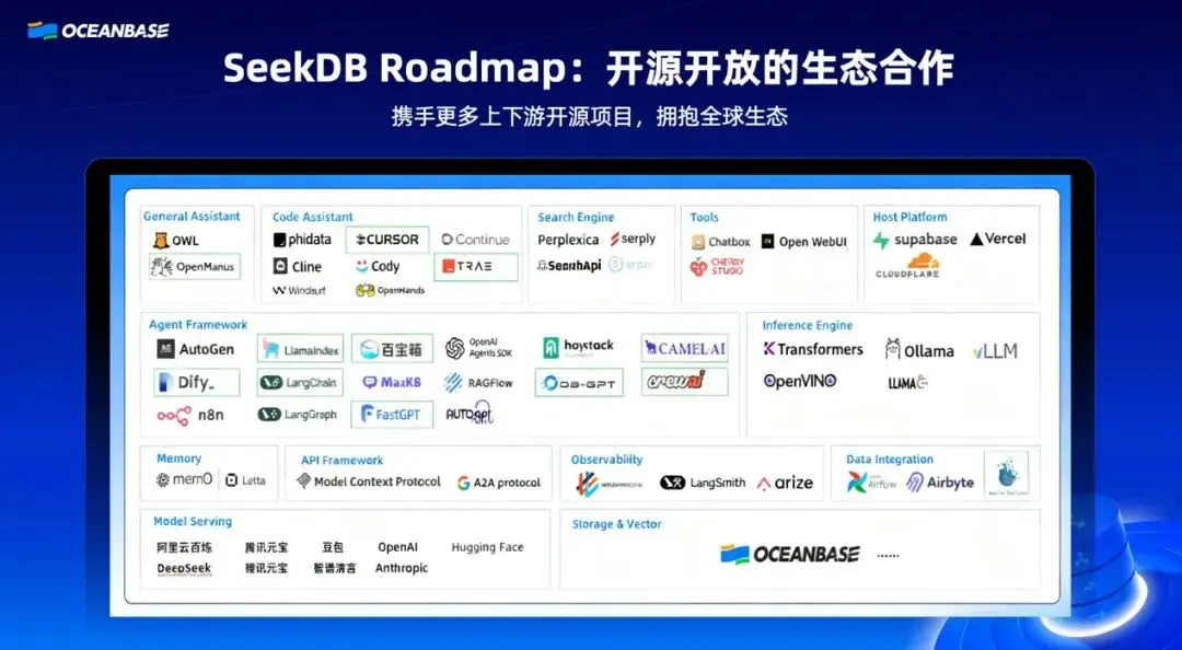 相比 OceanBase,seekdb 會更聚焦於開發者和生態。我們將積極與上下游生態夥伴合作,尤其期望能與 AI 開源項目、國內頭部開源項目和全球頂級開源項目建立深度合作。