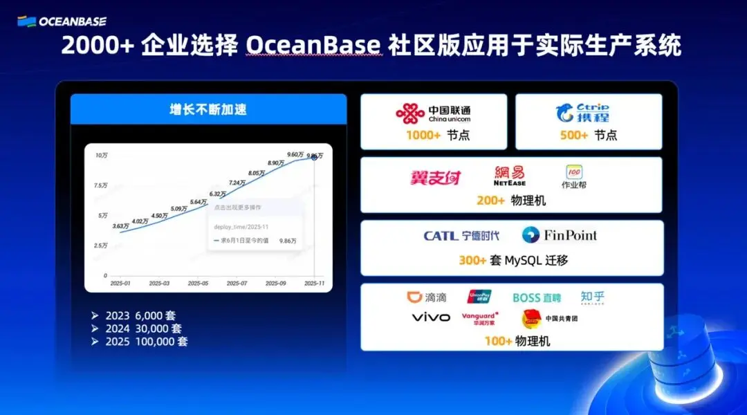 截至目前,OceanBase 開源已經四年,部署量突破 10 萬套,企業用户超過 2000 家。從增長曲線來看,前年 6000 套,去年 3 萬套,今年突破 10 萬套——這是一個指數級的增長態勢。