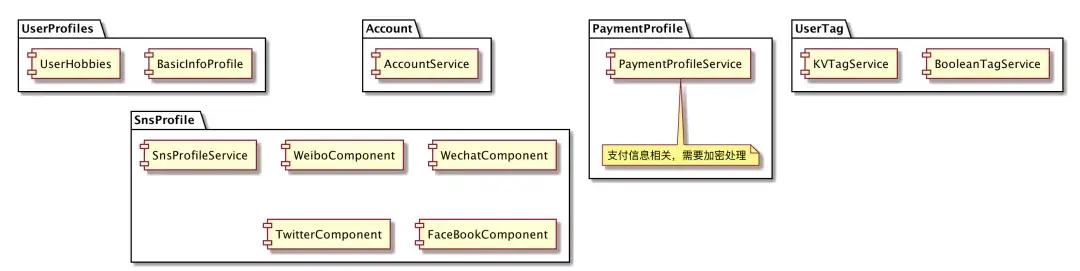 如花首先將會員先劃分為幾個Sub Domain,如處理賬號相關的Account,處理會員打標的UserTag,處理支付方式的PaymentProfile,處理社交平台集成的SnsProfile,還有一個其他Profiles,這裏我們不涉及Generic和Supporting Doman的規劃,主要從業務核心Domain出發。一個同學用PPT闡述了劃分結構和出發點,如下: