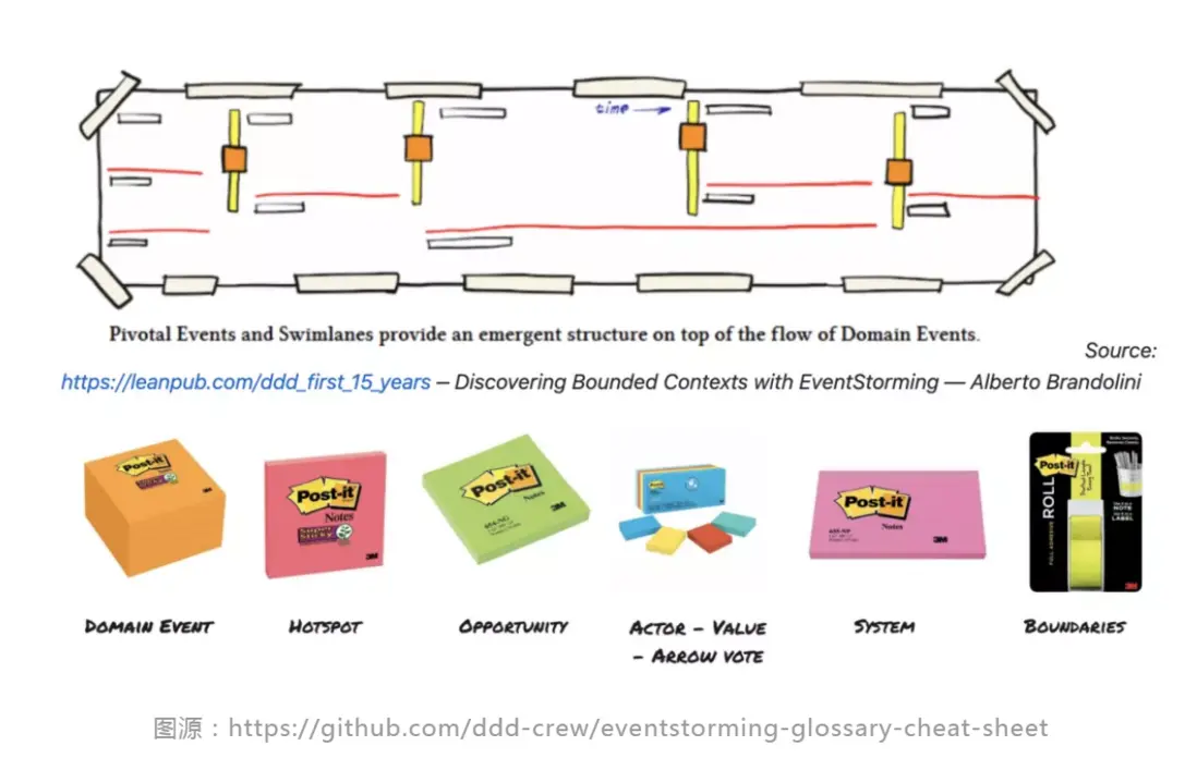我們有了DDD DSL來描述我們的架構設計,是不是就全面了,完全夠用,開發不愁了呢。還不是,我們知道在軟件架構設計和編寫代碼前,都有需求調研、客户走訪、領域專家溝通、需求分析、研討等等,這個在現實生活中還是少不掉的,其目的就是為了後續的架構設計提供素材並做鋪墊。那麼如何將DDD和這些前期操作整合起來?其實DDD有涉及這方面的內容,如EventStorming卡片: