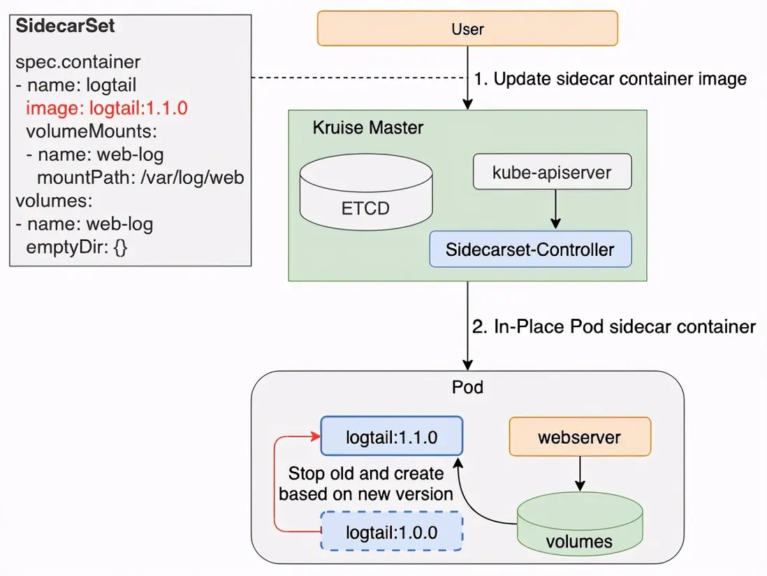 OpenKruise SidecarSet 基於 Kubernetes AdmissionWebhook 機制實現了 sidecar 容器的自動注入,因此只要將 sidecar 配置到 SidecarSet 中,不管用户用 CloneSet、Deployment、StatefulSet 等任何方式部署,擴出來的 Pod 中都會注入定義好的 sidecar 容器。