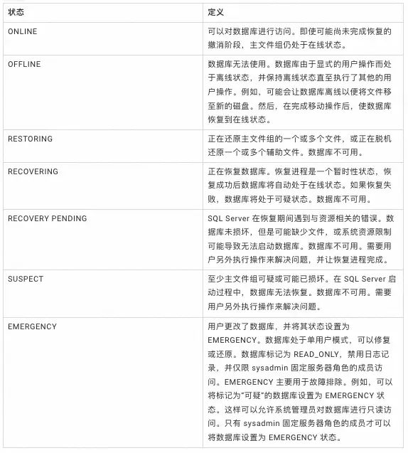 監控各數據庫是否正常運行,下表定義了數據庫的狀態。