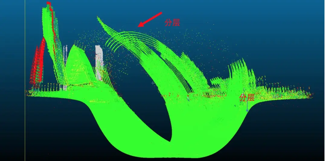 為了識別MTA問題,激光廠商設計了一系列專利技術,其核心是“激光發射間隔可變”,即相鄰激光脈衝發射的時間間隔是不同的,如圖4。而且這個發射間隔的變化具備週期性,其週期特點如圖5所示。當將點雲放錯MTA區間時,其測距不再是連續的,而是如圖5中列表第3列所示,來回跳躍。如圖6,錯誤的MTA區間,相鄰點來回跳躍,形成圖中的分層。
