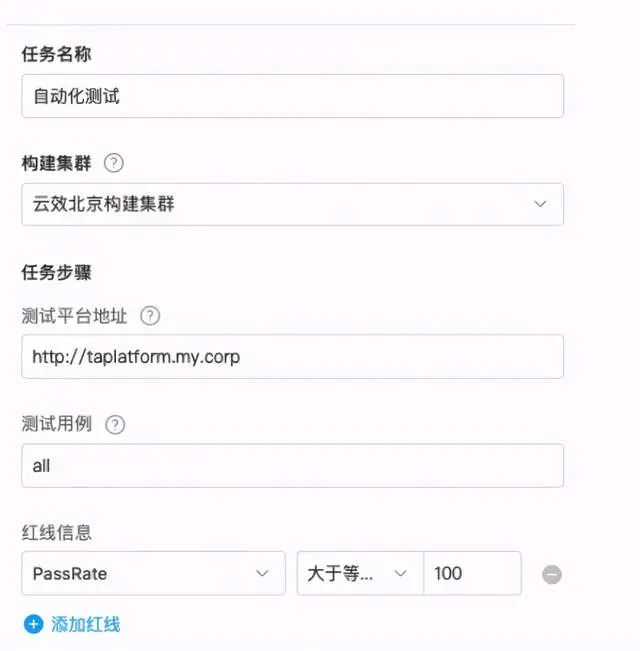 在流水線上添加空白任務節點,在其中添加一個步驟,選擇前面我們自定義的flow step(記得publish到對應的企業中)。在步驟中配置好測試平台地址和測試用例,並設置好紅線信息。