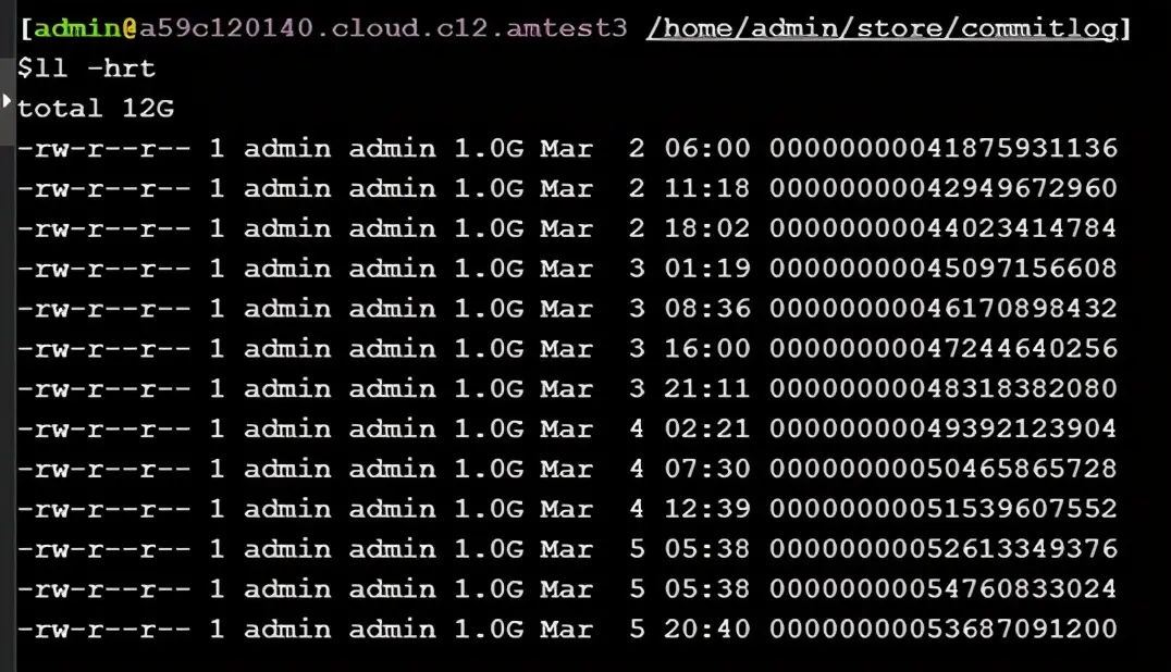 /home/admin/store/commitlog ⽬錄下(專有云場景),每個commitlog的⼤⼩固定為1G。隨着時間的推移,當Broker接收的消息量越來越多時,就會在該⽬錄下⽣成多個⼤⼩為1G的commitlog⽂件。