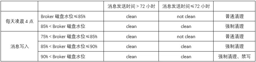 MQ會在兩個時機對commitlog進⾏清理,⼀是前文提到的每天凌晨4點;另⼀個是消息寫⼊時。通過以下表格可以更加清楚的看出具體的清理策略。