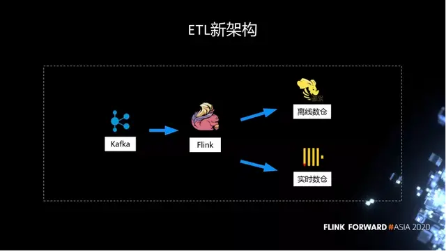 所以我們在建設 Flink 之後,做了非常多的工作。把原先 Flume 到 Hive 的流程替換掉,今天所有的 ETL 都是通過 Kafka,再經過 Flink,所有的打點都會進入到 Hive 離線數倉,作為歷史的保存,使數據不丟失。同時,因為很多作業需要實時的分析,我們在另外一個鏈路,從 Flink 直接進入 ClickHouse 實時數倉來分析。