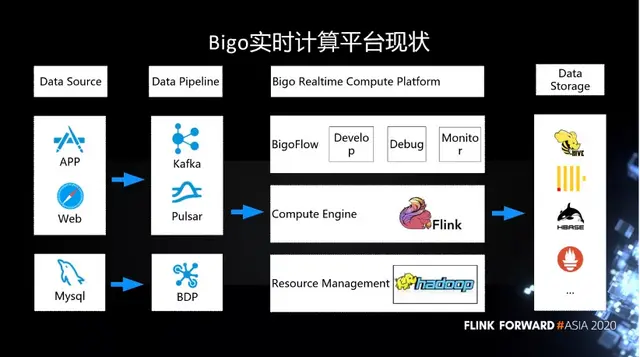 這些信息都會經過消息隊列,最終採集到我們的平台裏。消息隊列主要用的是 Kafka,現在也在逐漸的採用 Pulsar。而 MySQL 的日誌主要是通過 BDP 進入實時計算平台。在實時計算平台這塊,底層也是基於比較常用的 Hadoop 生態圈來做動態資源的管理。在上面的引擎層,已經統一到 Flink,我們在上面做一些自己的開發與優化。在這種一站式的開發、運維與監控的平台上,我們內部做了一個 BigoFlow 的管理平台。用户可以在 BigoFlow 上開發、調試和監控。最終在數據存儲上,我們也是對接了 Hive、ClickHouse、HBase 等等。