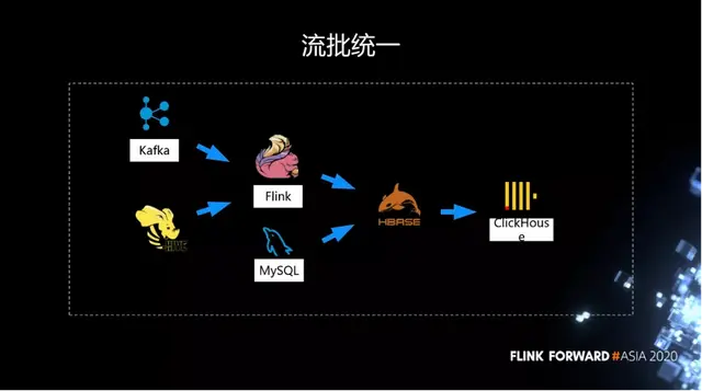 因此我們在第一步的改造過程中取了一個折中,沒有直接利用 Flink 在一個作業裏面把所有的維度 join 起來,而是把它拆分成了幾個作業。每個作業計算一部分維度,然後把這些結果先利用 HBase 做了一個 join,再把 join 的結果導入到 ClickHouse 裏面。