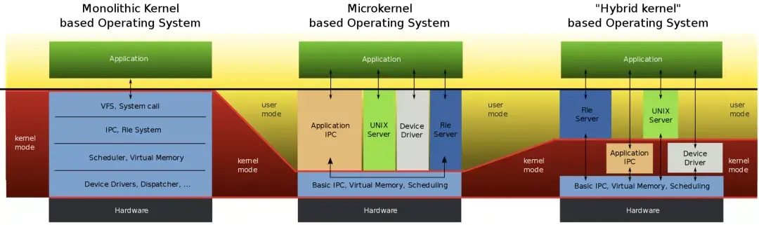 因此我們更需要一個微內核的架構設計,方便定製,而且非常小,可以實現功能的熱替換或者在線更新等,這就是微內核被提出來的核心需求。但是微內核有一個運行的效率問題,所以在微內核和宏內核之間,又有了Hybrid內核,主要是想擁有微內核的靈活性,同時在關鍵點上有宏內核的性能。微內核設計在理論上確實有效率問題,但是隨着芯片設計、硬件性能提升等,這方面或許已經有了非常大的提升,已經不再是最關鍵的問題。