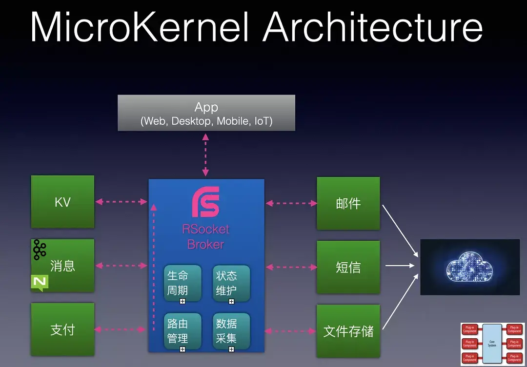 回到插件化架構的靈活性上,如果系統中有一個KV存儲的插件,你只要遵循消息格式或者通訊接口,就可以保存KV數據。但是你並不太關心是Redis存儲的,還是Tair存儲的,或者是雲端的KV服務,這就為服務標準化和可替換性提供了很好的基礎,這對應用上雲或雲原生化幫助非常大,整個系統有非常大的靈活性。