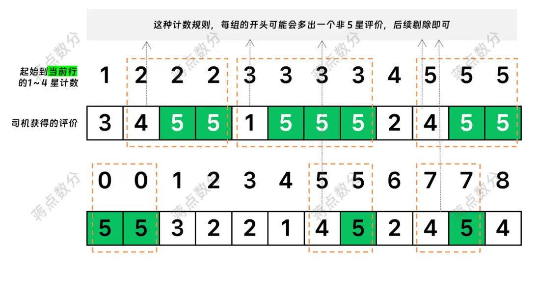 我們思維變通一下,如果想將連續計數的記錄能夠放在同一個組裏,那麼這個分組標識是關鍵。對於連續 5 星,它們的有什麼共同點?是每一個 5 星評價前面有多少個非 5 星(1~4 星)的評價。為了方便理解,我繪製一個簡易的説明圖: