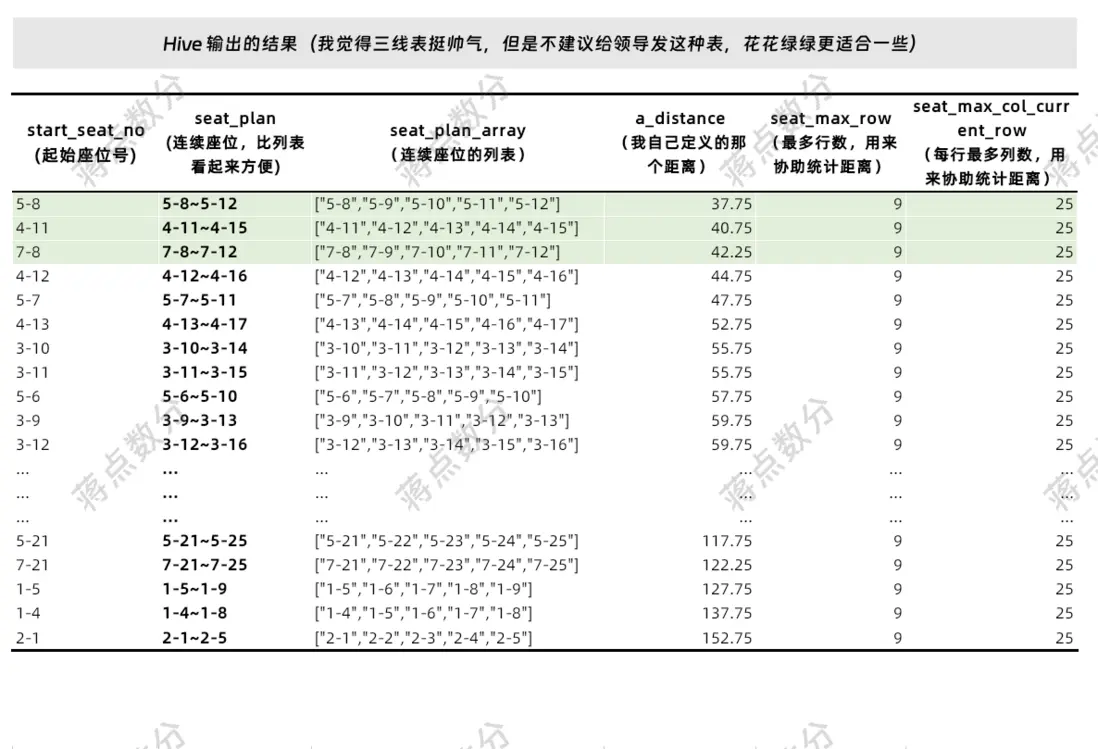 奈何我想象力有限(未來可能增加一個 SQL 破案系列,目前手裏有幾篇草稿,比如通過行車軌跡計算罪案策劃地點)對於市面上的題,如果增加一些創新點,我覺得也值得跟大家分享。比如這道題,我就增加了“最優選座”的邏輯。下面直接説題: