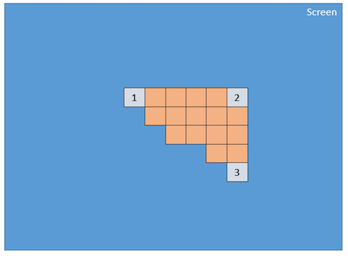 Using these three pixels (which define a 2D triangle on the screen), the GPU will interpolate all values attached to the pixel (at least their positions), and the pixel shader will be applied to every pixel included in the 2D triangle in order to generate a color for every pixel: