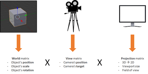 Using the resulting matrix enables us to transform 3D vertices to 2D pixels, while taking into account the point of view and everything related to the position, scale and rotation of the current object.