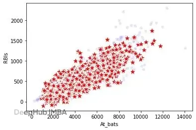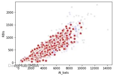 真實數據(藍點)和GMM生成的合成數據(紅星)的At_bats與RBIs
