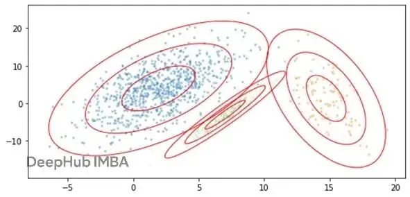 每個簇中心周圍的同心橢圓環代表距離中心那麼遠的位置被生成的概率(越靠近中心概率越高)。之所以是橢圓不是圓,因為GMM考慮數據的形狀(通過協方差矩陣):某些特徵相關的話,簇往往呈現橢圓形而非圓形。