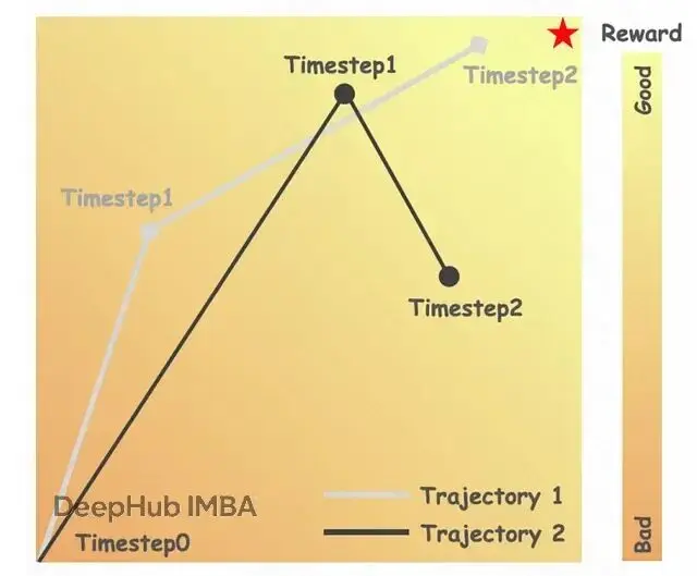 軌跡1有更好的最終圖像,但與軌跡2相比,有更差的中間步驟(t=1)。説明標準GRPO如何錯誤地獎勵軌跡1中的壞步驟。