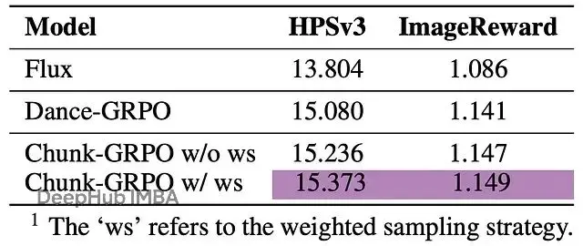 Chunk-GRPO在訓練用的域內獎勵模型(HPSv3)和域外模型(ImageReward)上都持續高於標準GRPO,説明改進具有泛化性,不是單純針對測試調優。帶加權採樣的版本(
