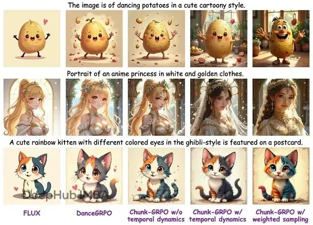 任何方法最終都要看輸出質量。Chunk-GRPO在這方面表現不錯,研究團隊把它和基礎FLUX.1模型以及標準步驟級Dance-GRPO做了對比。