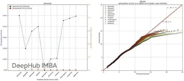 摘要圖顯示擬合優度檢驗在所有top分佈上得分不錯(低分)。但看bootstrap結果,除了一個分佈,其他全都過擬合了(圖8A橙線)。這不意外,因為前面就注意到了過擬合和欠擬合。QQ圖證實擬合分佈與經驗數據偏差較大(圖8B)。只有Johnsonsb分佈勉強合格。