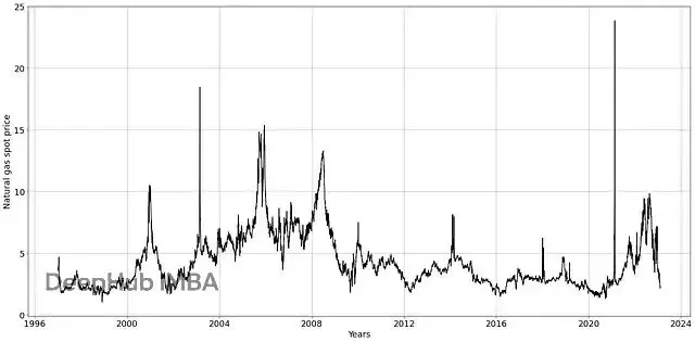 先畫個天然氣現貨價格的折線圖,看看有沒有明顯趨勢或其他特徵(圖6)。2003年和2021年有兩個明顯峯值,暗示全局異常。價格走勢有自然起伏,局部高低點。從折線圖能建立對分佈的初步判斷。價格主要在[2, 5]區間波動,但2003-2009年有幾個特殊年份,區間偏向[6, 9]。