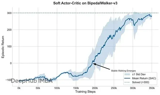 到了150k-250k步,方差突然爆炸。這是個關鍵轉折期,智能體開始嘗試高風險策略,有時走得漂亮,有時摔得很慘。只有進入300k步之後的穩定區,均值高、方差收窄,這樣才能考慮"凍結"策略用於實際部署。方差收窄意味着策略從"碰運氣"進化到了"真會走"。