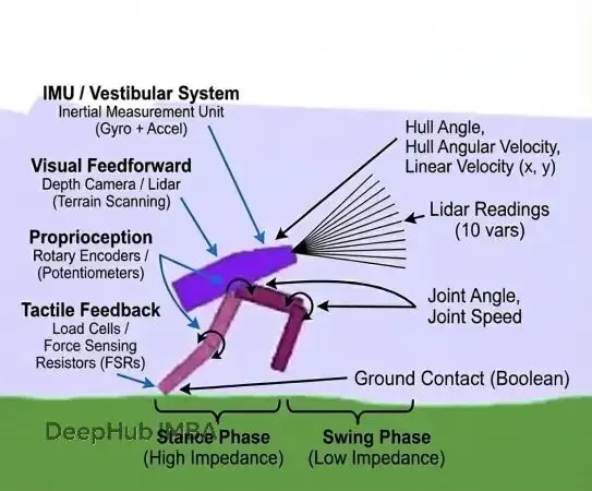 軀幹角度和速度對應前庭系統——"軀幹"代表質心位置,硬件上用IMU(慣性測量單元)採集平衡數據。關節編碼器對應本體感覺,仿真裏提供的關節角度和速度,在真實假肢上由霍爾傳感器和旋轉編碼器獲取。激光雷達對應視覺前饋,現代研究型假肢已經開始集成深度相機來預判地形。