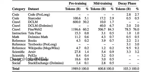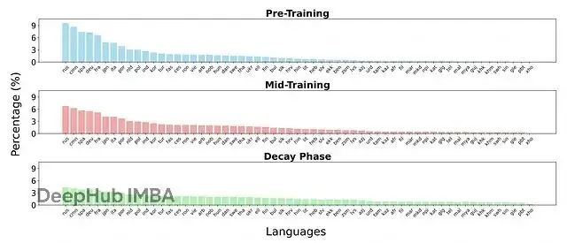 非英語部分主要來自FineWeb2,以及它的高質量過濾版本FineWeb2-HQ(覆蓋20種語言)。多語言維基百科用的是MegaWika v2,包含60種語言,並且都經過了篩選。英文語料還補充了好幾個精選數據集:Dolma裏抽取了StarCoder、Stackexchange、Arxiv和PeS2o;Dolmino貢獻了數學、篩選過的Stackexchange、Tulu Flan指令數據和書籍;ProLong則提供了代碼倉庫和教材。