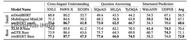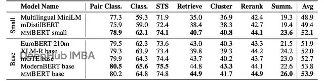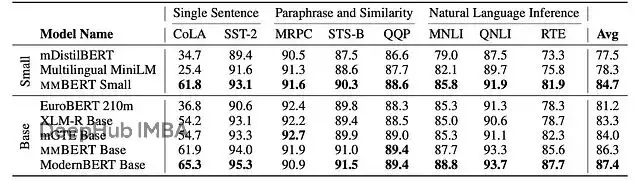 mmBERT small在英語GLUE上的成績相當亮眼,平均84.7分,遠超MiniLM的78.3,甚至比之前一些base規模的模型還強。mmBERT base雖然訓練數據以非英語為主,英語性能還是逼近了ModernBERT(86.3 vs 87.4)。