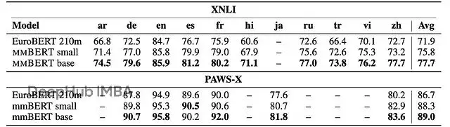 即便在EuroBERT的優勢語言上,mmBERT base和small在XNLI和PAWS-X上仍然佔優。舉個例子,阿拉伯語XNLI上mmBERT base得分74.5 F1,EuroBERT只有66.8 F1。